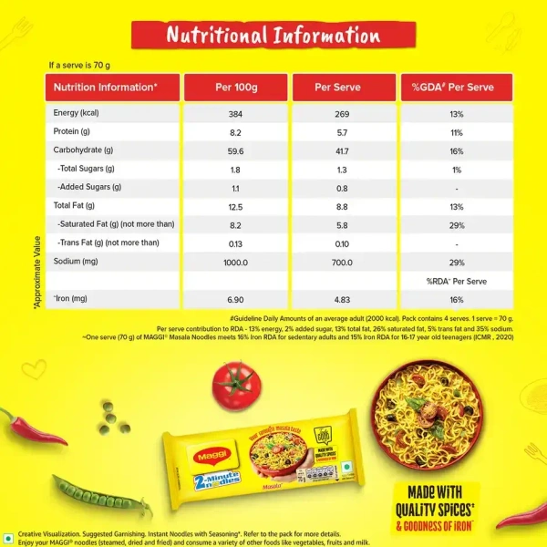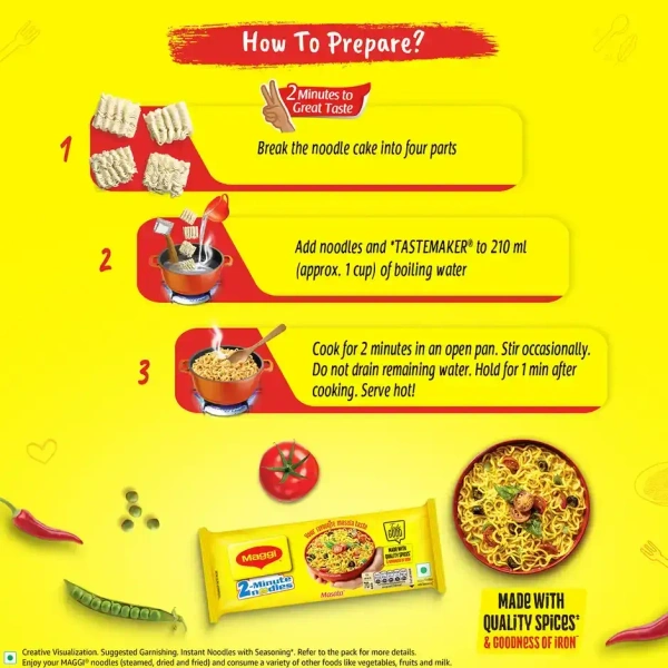 MAGGI 2‑Minute Instant Noodles, Masala Noodles With Goodness is India’s favourite instant noodles – crafted with quality spices, authentic masala flavour, and ready in just 2 minutes. Perfect as a quick snack, lunch, midnight bite or comfort food for all ages.
